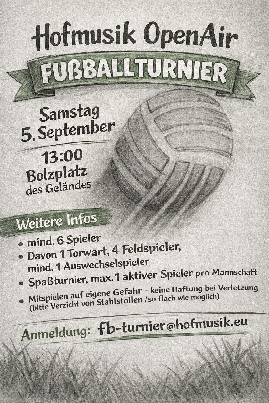 Das Hofmusik Open Air ist eine 100% privat organisierte, kommerzfreie, nicht öffentliche Veranstaltung, die natürlich keinen Eintritt kostet und trotzdem sponsorenfrei ist und bleibt. Bands, Musiker und DJs spielen für lau oder allenfalls etwas Benzingeld. Hier verdient keiner an irgendwem und trotzdem sind am Ende hoffentlich alle glücklich - so wie die letzten Jahre immer. Ein Fest von Freunden für Freunde.